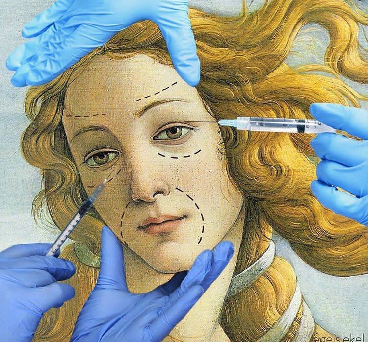 The modern artist Egel Islekel (@egelislekel) strongly influenced our choice for the first re branding of our logo into something original. He is a Turkish interior designer and graphic artist who takes a classic idea and juxtaposes it with a modern canvas or trope to create a medley of ancient and contemporary turmoil. He subjects infamous figures to modern circumstances in a series of cleverly manipulated images. It was his pictures of Venus herself in a modern setting (running on a treadmill, wearing makeup and getting plastic surgery) which resonated with us- it exaggerated femininity, commenting on the hollow superficiality of modern life. Even a symbol of purity and transcendence succumbs to the artificial criteria used to navigate contemporary popular culture.