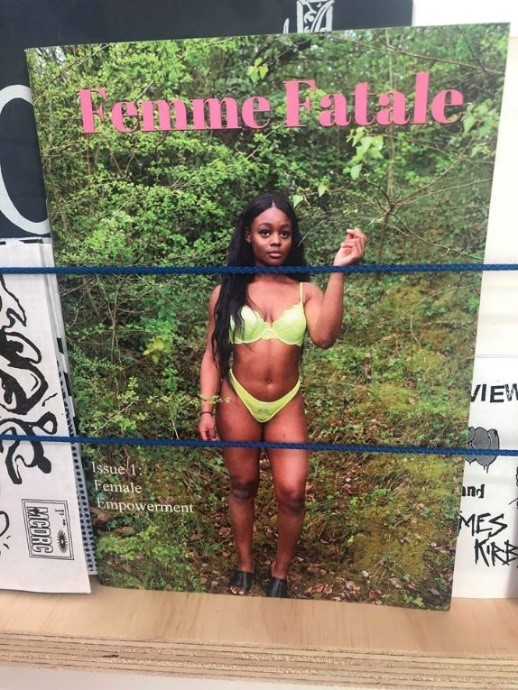 After visiting the Nottingham Zine Library, we were inspired by ideas of designs such as collages, transparent covers, uses of stereotypically feminine pastels and hand-written fonts that we took as precedents and existing models for the project. Femme Fatale’s first issue on female empowerment particularly stood out to me as it featured a black woman on the cover; reminiscent of a prelapsarian Eve, she was boasting a green bikini and standing amidst matching shrubbery. The full body shot helped shape the physicality of the image I selected for our own cover.