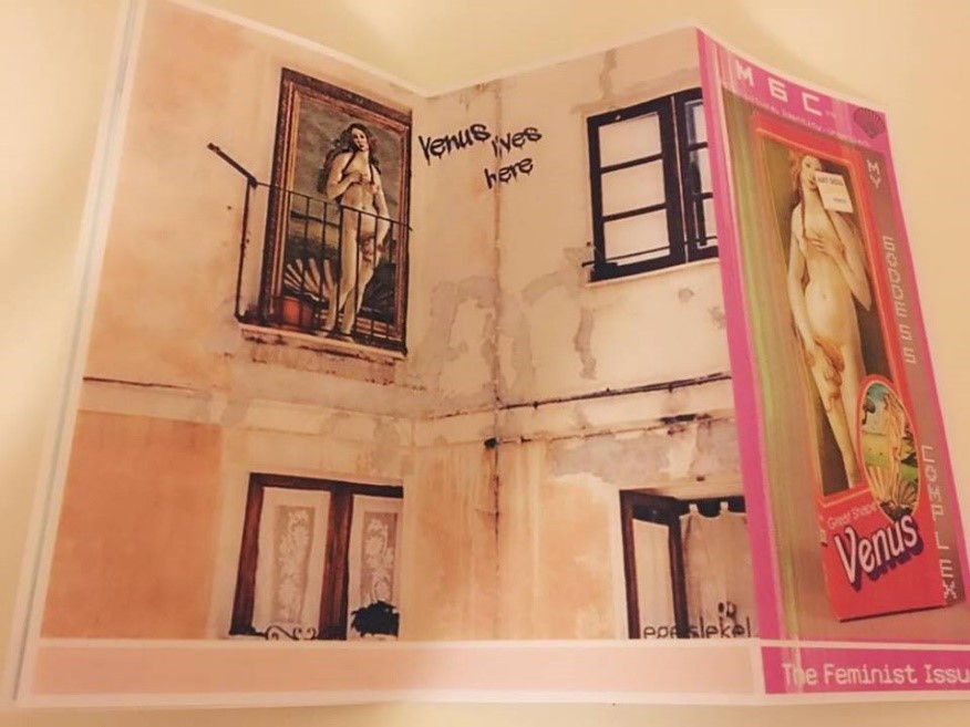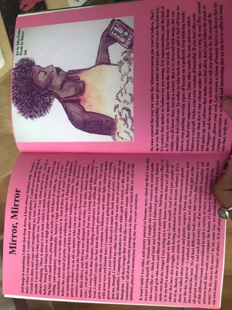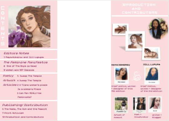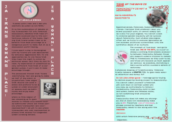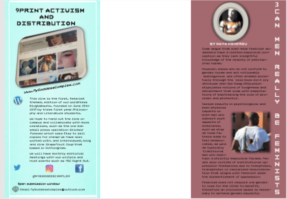 Beginning the zine was a team effort, with a circle of friends into creative projects, we were lucky to have friendly faces that were only happy to contribute art work and written pieces whilst we would still go on to edit, design and include our own articles in the zine too. My only previous experience where zines are concerned was co-editing a small scale first attempted zine for a friend’s own project called Grapefruit Soup. I only contributed with a book review and the digital aesthetic on that instance however, so, you could say I was apprehensive on how this would go. Luckily, I had at least some InDesign knowledge from the University newspaper, which is honestly better than none with that app under timed situations. So, I tried using InDesign and Photoshop to design one of our editions of this zine as we have created two. I also visited the Nottingham Zine Library in the Christmas holidays with my friend from his other project, and found some much needed inspiration in creating this one. Maya and I knew that if we were going to be political then we would definitely go towards a feminist zine. Having written articles under the umbrella of feminism on My Goddess Complex it seemed appropriate and ever so relevant that we thematise the zine to a movement we feel strongly about. This zine is not just about a one-dimensional feminism but about a true equal feminism inclusive to all with awareness of intersectionality and men as feminists too.