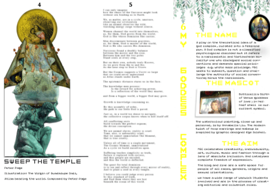 Creating this zine for the Warwick small press publishing module has been inspiring, well-motivated, and truly a good opportunity all round. Sure, it began as just a final project, but for me and my friends who created our website/blog, it was a chance to create our first ever zine for My Goddess Complex. My Goddess Complex began almost two years ago in the third term of our first year at Warwick after we had finished our first set of university exams and were feeling liberated and powerful (and, also, brimming with creativity). Basing it on lifestyle, art, music, fashion, and culture, we started as a blog on WordPress with our own domain and decided to make social media platforms to create something of a brand on Facebook, Instagram and Twitter. Just recently we hit the 50 articles posted online mark, having taken needed breaks in term time, but we always took the approach of writing when we feel like we want to or have something to say on a topic. This way we never feel pressured under unnecessary deadlines we would give to ourselves and can write as much or as little as we would like and self-publish. Having done this, the small press module has been the perfect insight into the physical publishing aspect of the editorial world, and motivated our career goals of becoming professional editors; but, of course we have societies for practice for now.