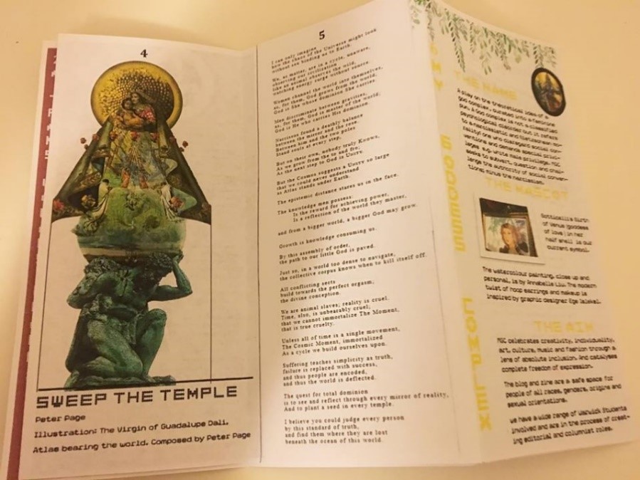 The artistic aspect of this zine wouldn’t have been possible without our contributors: several creatives with their own aspirations and pursuits, some of whom are venturing towards their own forms of DIY self-publishing. I’d like to thank the artists, illustrators and writers who are both published in the zine and blog, along with everyone else who’s encouraged us to keep writing for the sake of our sanity and the positive message we wish to spread. Peter Page’s Sweep The Temple, an allegorical poem inspired by the theme of woman worship, takes on a cosmic rhythm and melody and is a textual illustration of his composed artwork- The Virgin of Guadalupe (by Dali) and an Atlas bearing the world. He sees them as two versions of the exact same thing, which is why they are folded together in a way where the picture ‘kisses’ the text. Furthermore, interviewing local students such as Kenyan artist and law undergrad Naila Aroni and collaborating with fellow zine/blog editor Liam Skillen from Grapefruit Soup has helped us create a small interlinked community of enthusiastic creatives. Most recently, Nottingham Trent animation student Frankie Ward has created an art piece of us (the blog editors) which we will feature soon.