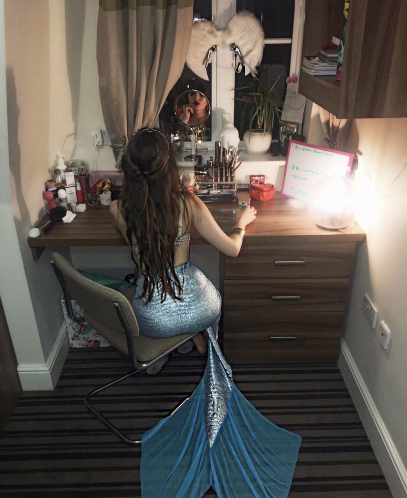 The key to surviving the night as a walking contradiction (ahem, a mermaid with legs) is to get a skirt with some form of slit or a beach cover up that looks like a mermaid tail. Add a crown and eye jewels to be the most extra sea queen you can muster.