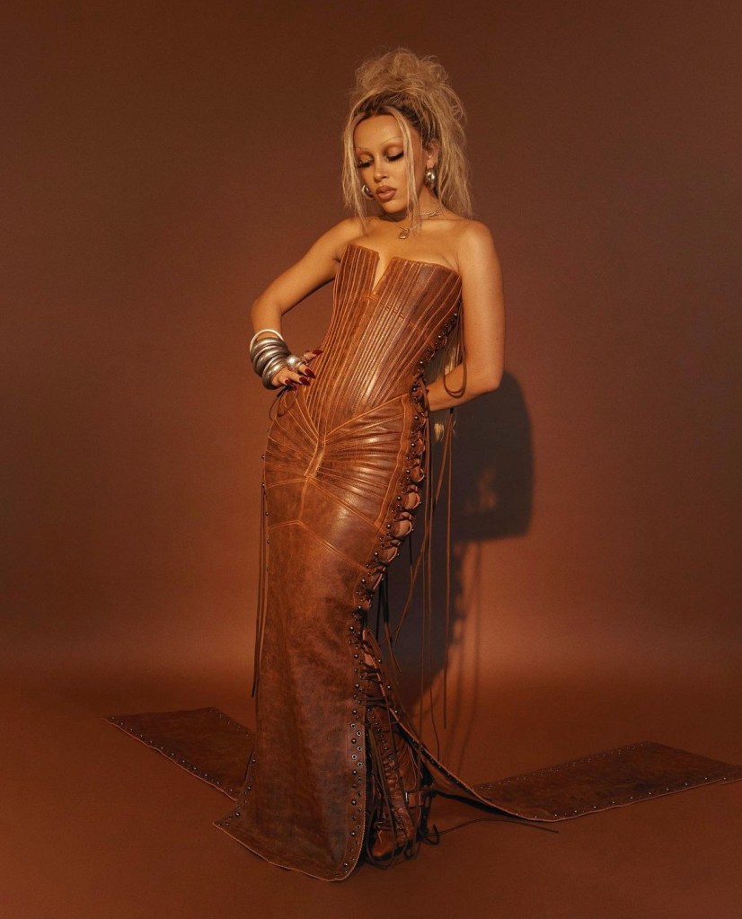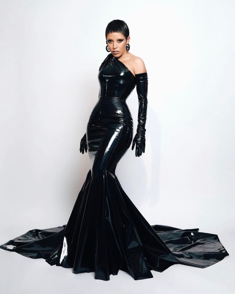 Doja Cat stunned – as usual – in a sleek, black, dominatrix-esque get-up with a one-shoulder, cinched-in style and mermaid cut at the hem. The longline evening gloves made outfit number one that much more chic.