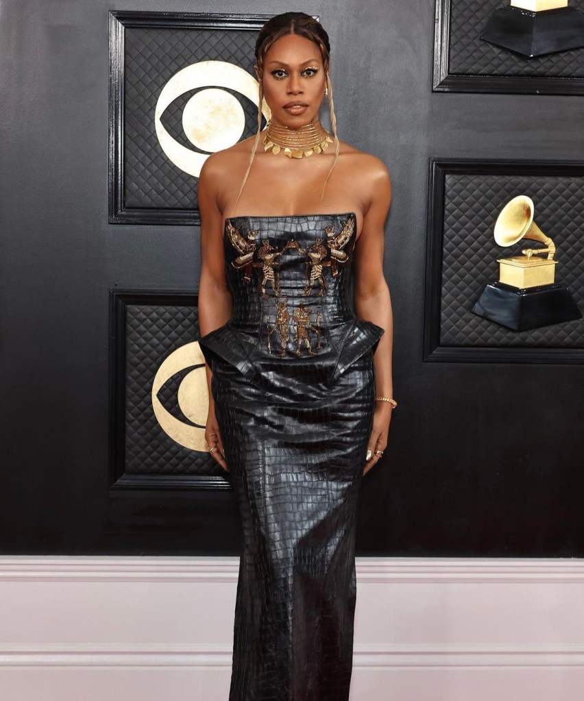 Laverne Cox took to the carpet in an Egyptian-inspired Kim Kassas Couture look. From the black snake and alligator print dress with tribal emblems in brown on top to the golden, tribal neckpiece – Laverne came to make a statement. She knows what looks good as her makeup and hair were properly fitted to complement her outfit whilst keeping to the gold of the iconic Grammy award.