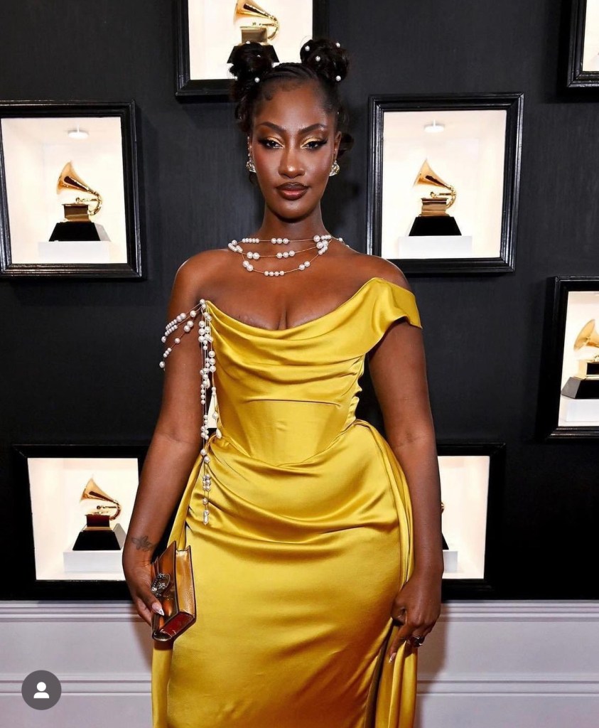 Tems has become the first Nigerian artist to win a Grammy – and look golden whilst doing so. She kept her sultry eye look and paired a golden lid with a gorgeous shaped dress with a corset up top and silky flow below. With beads in her hair and as her accessory, Tems being a true bad bitch, knew that a dark lip with gloss is always a winner.