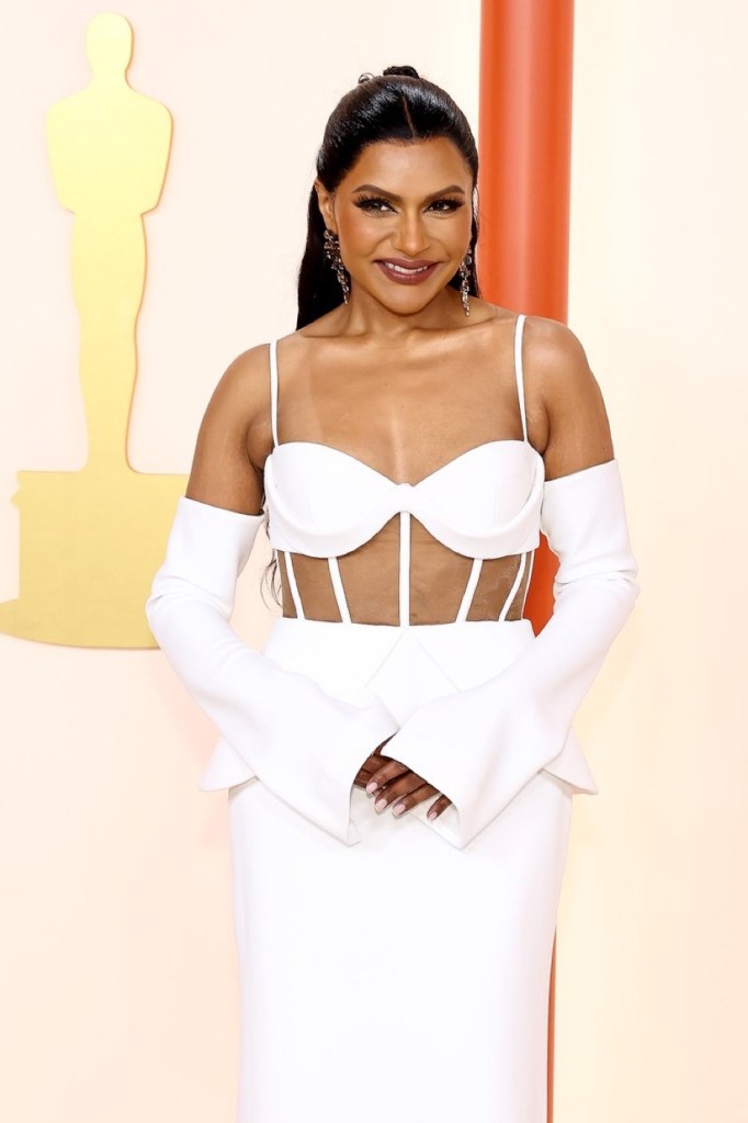Mindy Kaling tried not one, but two Vera Wang dresses for the Academy Awards – posting both this white dress and the same version in black to her Instagram. The writer and actress works both colours effortlessly, and I can’t help but notice that her style choices have had a glow up in the past year (we see you new stylist).