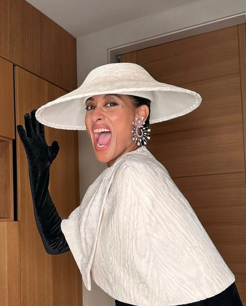 One thing Tracee Ellis Ross is going to do is have fun. My personal future fashion icon made her presence known in Balmain, wearing a sleek, black velvet trouser look with a sheer, silk shawl on top like a skirt. The opera gloves came out to play again and the cream, textured overcoat and angled hat paired with the statement earrings simply topped off the entire outfit.