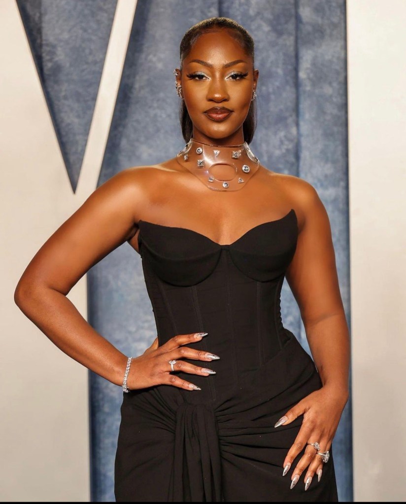 I love, love, love the shaping up top on this black Bardot, corset-type ‘fit Tems dazzled in for the after party. Her sleek ponytail and iced accessories make the look pop and as usual, Tems is wearing the look and not the other way around.
