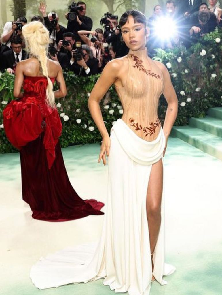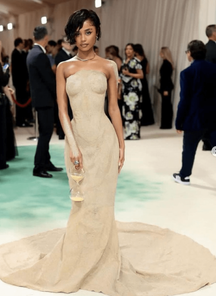 Tyla literally embodied the hourglass time emoji in an ephemeral, sculpting Balmain garment, paired with a matching handbag, that was one of the highlights of the night – especially as she was carried in for her entrance, by a group of tuxedoed chaperones. As her first met gala, she got 10/10. We can’t wait to see what she’ll don next year.