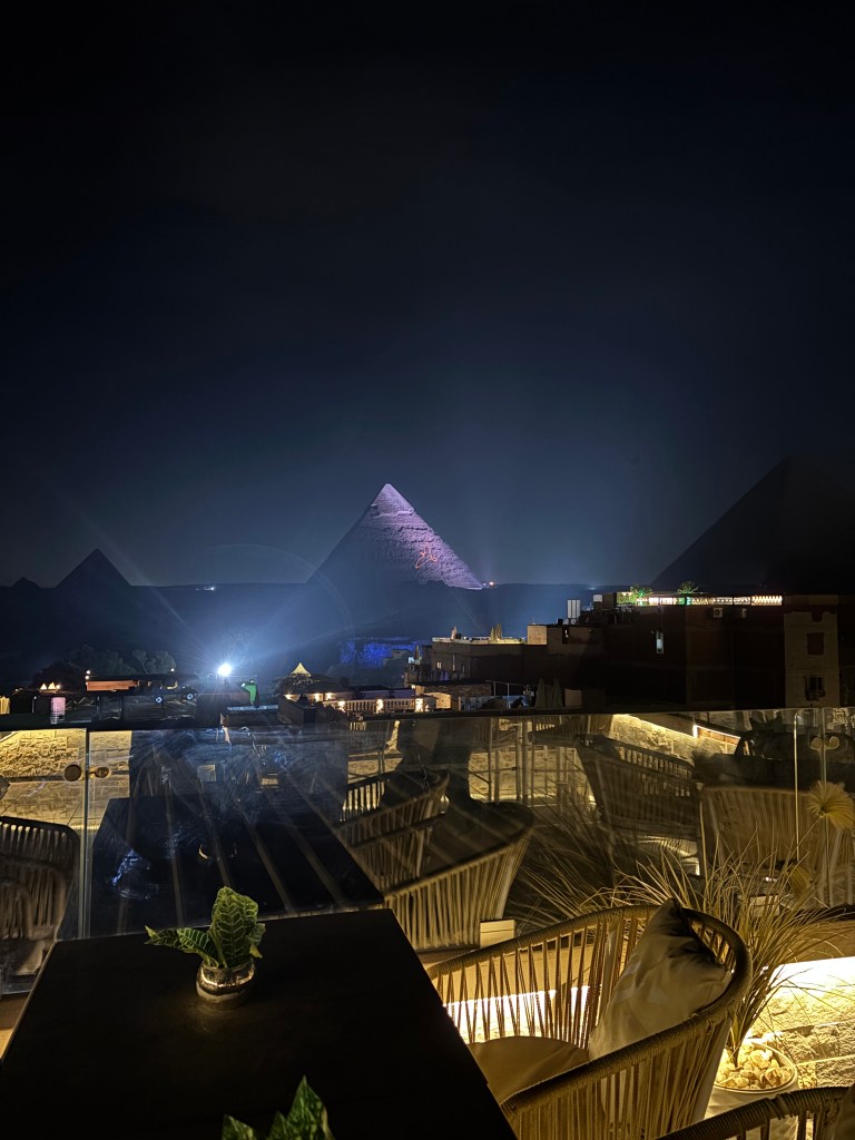 Thursday night – Get settled in your hotel. If you stay in Giza, you may be lucky enough to get a rooftop view of the pyramids which means you’ll get sky-high seats to the night time light shows.