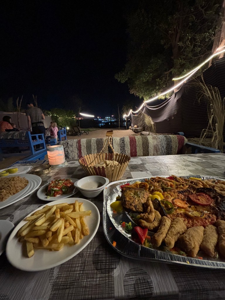 Tuesday evening – Languish with a seafood platter from the same go to restaurant by your apartments, the Little Nile Beach. Egyptians are so hospitable and that culminated in our experience of the hosts here in Luxor and the restaurant owners themselves – they’ll even invite you to use their deck chairs and benches anytime of the day to read, and chill even if you’re not a paying customer. The owner, Ahmed, found us a good luck coin under the table’s candle on our first night dining there, and said we were calm, with “good souls and hearts” and “fitting for Africa, like cousins” – Luxor definitely brought a tear to my eye once or twice.