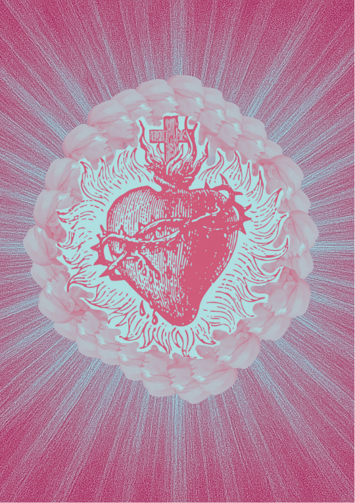 I dream of a world where women love each other—even if, for now, that love is just a heart that still bleeds. The bright pink and blue colors, flashy and kitsch, play with the stereotypes of what is “assigned” to women and men.
