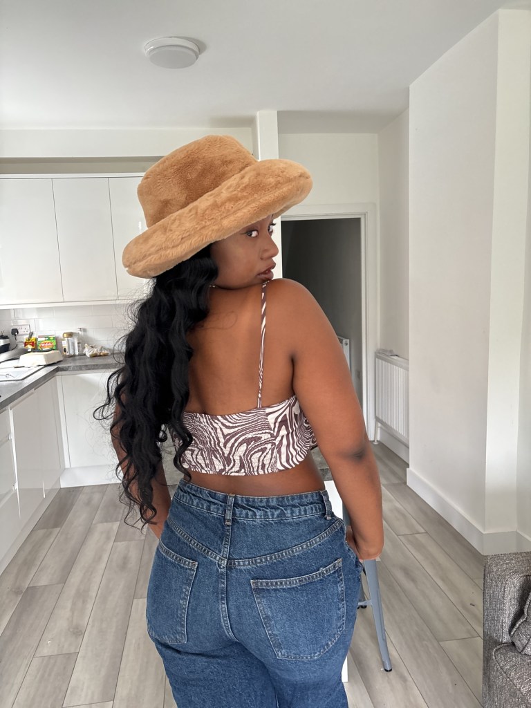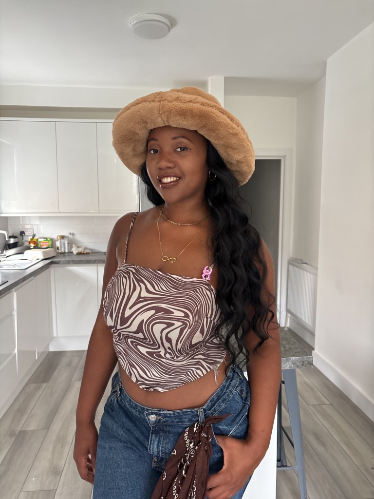For my outfit then, after being torn between wearing my first jorts borrowed from my housemate and friend, I decided to go with my blue dad jeans – and I’m barely ever caught outside in jeans – with a little brown zebra-patterned crop top, braless, my orange/red Nike Cortez trainers which a few others were wearing, my tan fluffy bucket hat and a dark brown bandana tied onto the front of my jeans.