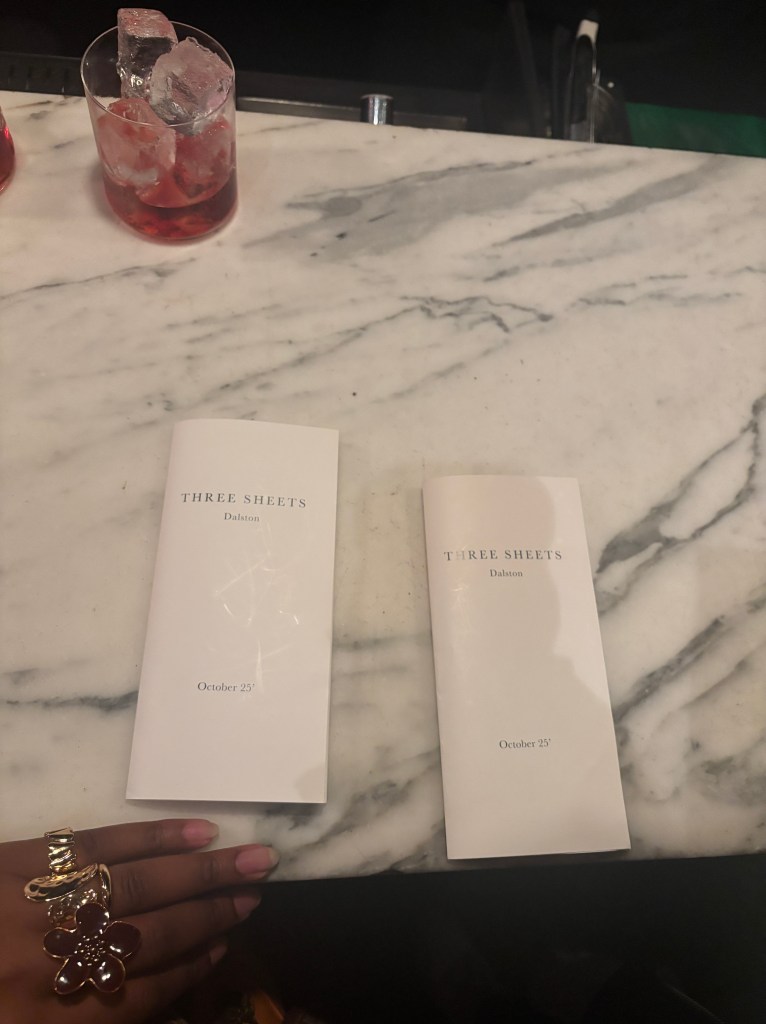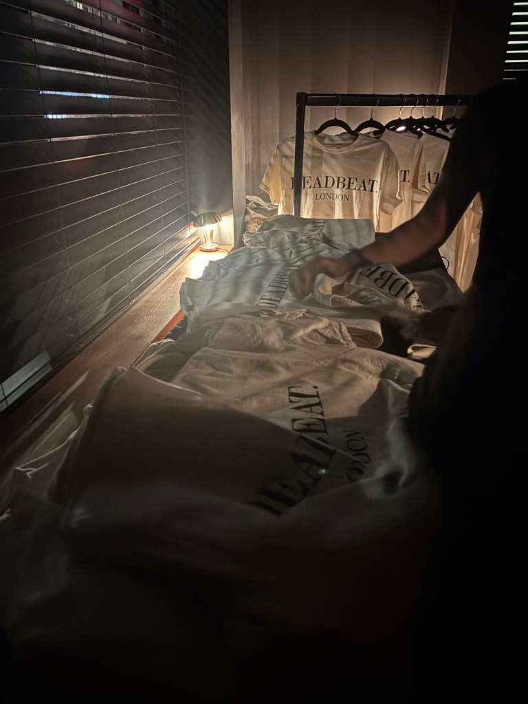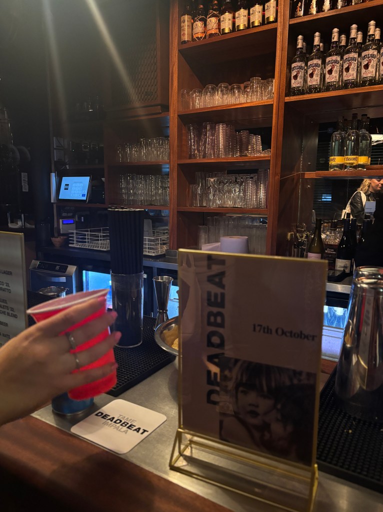 Inside, ‘Deadbeat’ had fully taken over. Every guest was handed a Tame Impala ‘Deadbeat’ T-shirt and tote bag on arrival – an immediate win – and the bar, tiny and candlelit, was giving away free drinks with the same sense of quiet decadence. The long, narrow tables along the windows were lined with coasters, enamel pins, and little ‘Deadbeat’ menus, like a merch display made by an art student with taste.