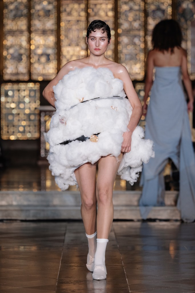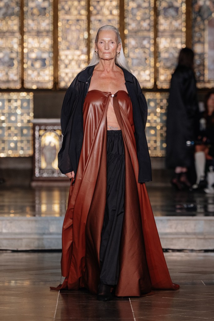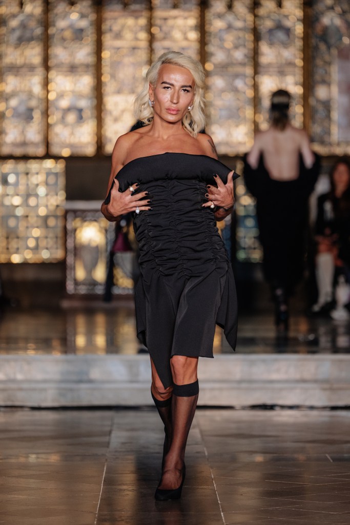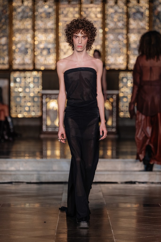 This season, fractures become metaphors: tailored shoulders unravel into silk transparencies, strict cuts melt into organic drapes, and deadstock textiles are reborn as “ghost fabrics,” each carrying echoes of resilience and renewal. The palette oscillates between restraint and rebellion — muted greens and maroons clashing with luminous transparencies — embodying a world where strength and fragility coexist.