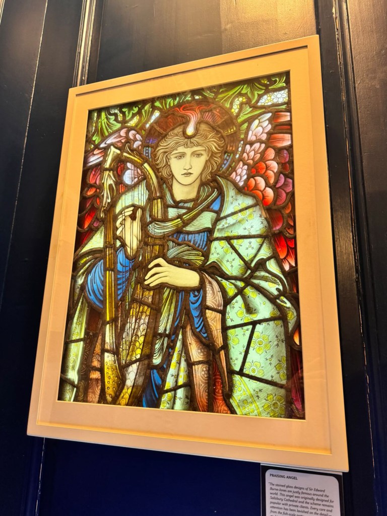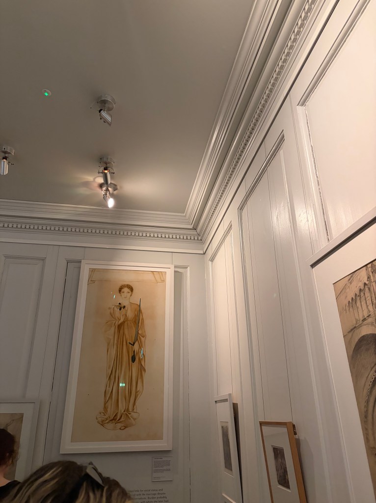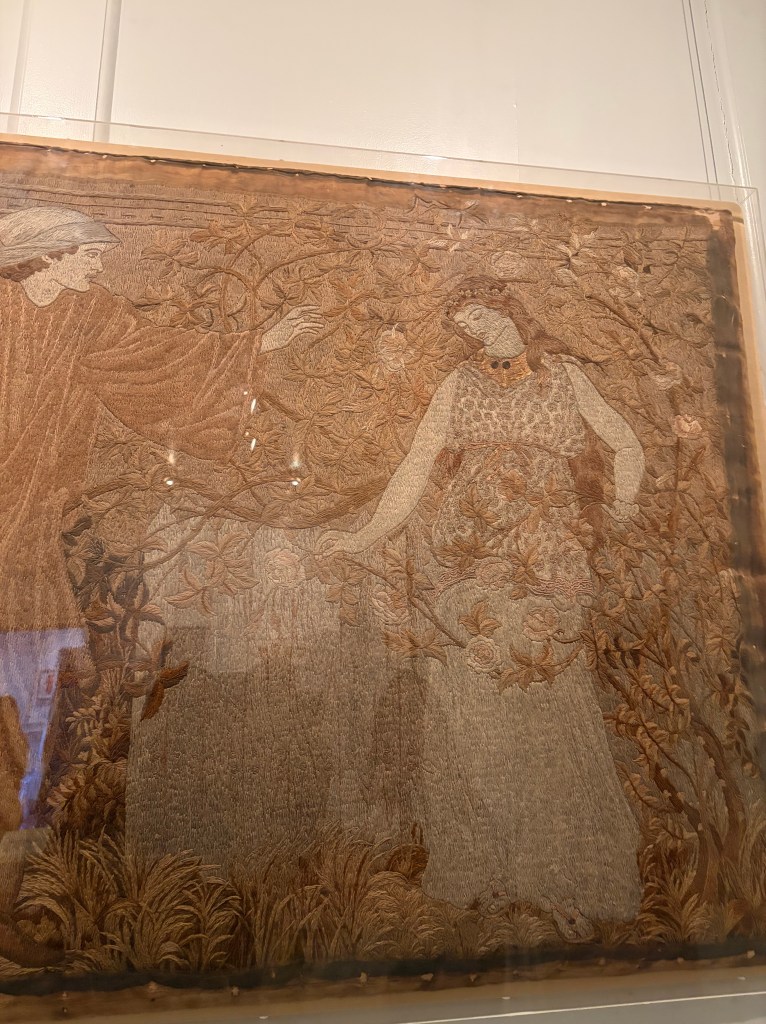 There’s also build your own glass stained windows with stencils, and you can trace them in another station, then you can look through magnifying glasses to look at the front and back to compare textures on one textile. My favourite part were the life-size, antiquated books that show drawings like the other frames from the pre-Raphaelite era with Dante Gabriel Rossetti mentioned with the artists being a source of inspiration. It encapsulated everything that we love with the overlap to the Romantic period and our own inspirations for this platform.