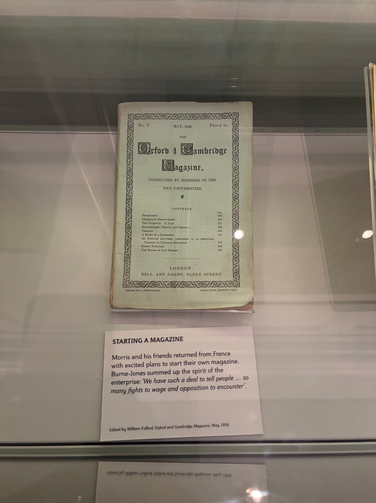 Another picture shows an Oxford and Cambridge paper magazine, labelled with how Morris and his friends returned from France, excited to start their own magazine. This reminds me of our own platform here and how it’s grown and continued on our similar dreams to start a magazine, which we fashioned with zines in print and online.