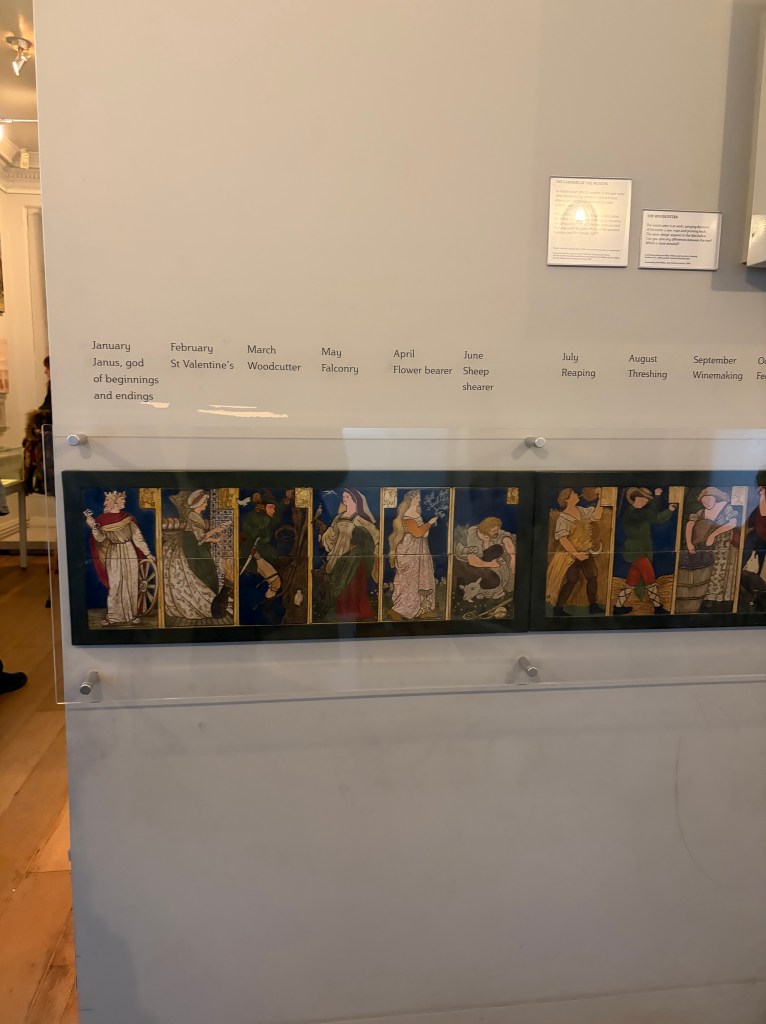 There’s a timeline for the year with January showing the God of beginning and endings, February with St. Valentine’s and September as wine-making. There’s vases with elaborate prints, furniture with stunning paintings, and materials with varying textures show people in a Romantic lense.