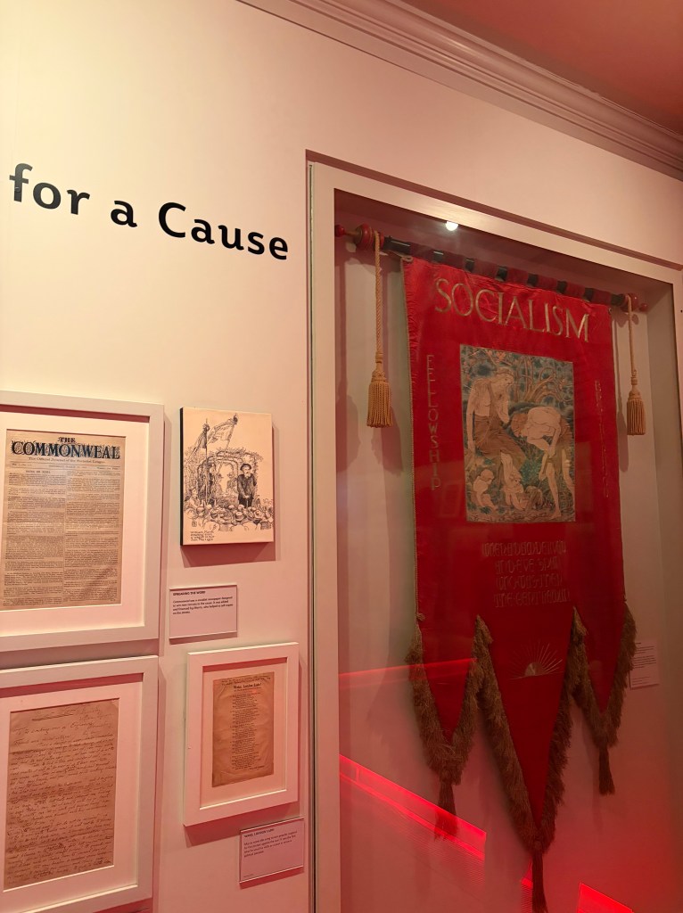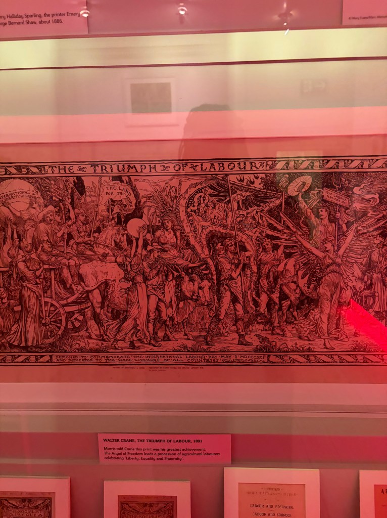 An exhibition upstairs shows louder patterned designs with a sofa, curtains and a dress that appears multi-cultural alongside a TV that displays the textiles being made. Across from this, another exhibition has a red-hue light and holds a red flag for Socialism next to where it states ‘for a cause’. There’s also a projector showing Morris and friends like a mini documentary displayed onto the wall, where you can sit and admire. In the middle of these contrasting exhibitions, there’s a fort (made from Morris inspired designs) where children can play and draw in the back.