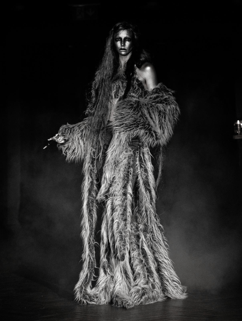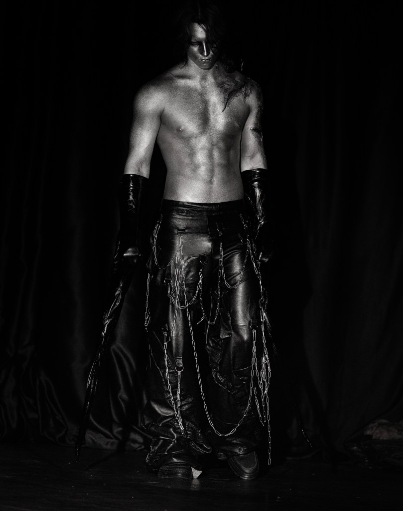 Silhouettes emphasised tension and intensity. Sharp tailoring, elongated lines, and layered forms created an architectural drama, while dark textures and rich fabrics amplified the collection’s emotional weight. Every garment functioned as a character, inhabiting a world where identity is tested, performance becomes storytelling, and menswear carries conceptual weight.